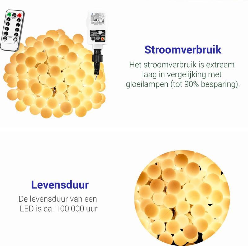Breng sfeer in je huis of tuin met de warm witte kerstverlichting (Sneeuwbal Verlichting) van Voltronic. Met de 50 bollen en 8 verschillende programma's creëer je de meest feestelijke vormen tijdens de feestdagen of gedurende het jaar. De bollen aan deze string geven een net even ander effect dan standaard kerstverlichting. Door de LED Kerstlampjes in combinatie met de Timer is hij ook nog eens erg energiebesparend. Kerstverlichting buiten of Kerverlichting binnen, deze lichtsnoer is voor beiden geschikt. Voor het raam, aan de muur, in een boom, tijdens kerst, een feest óf buiten in de tuin.