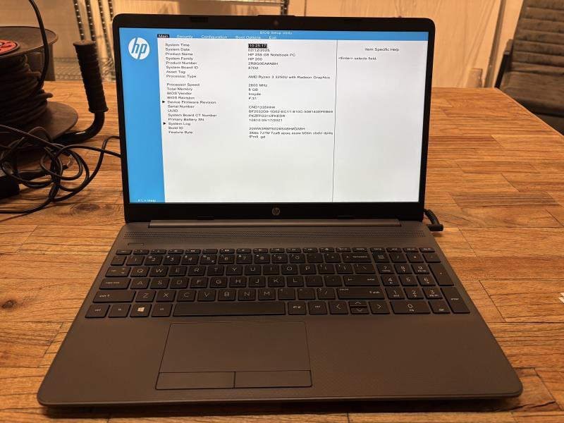 1 HP laptop, model 255 G8, AMD Ryzen 3 3250 U processor@2,6 gHz , 8 GB RAM, met lader (Gewist en zonder software)