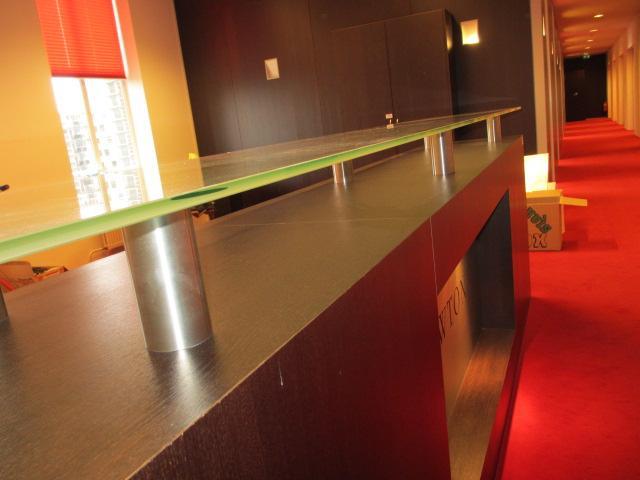 1 receptiebalie met open kasten en glazen opstand (afm. ca. 330 x 100 x 40)