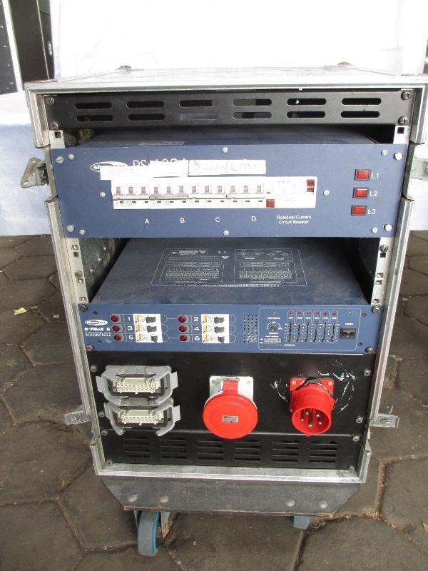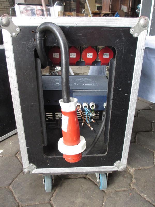 1 verrijdbare flightcase met 1 Showtec krachtstroomverdeler, type PS-6304 en 1 Showtec dimmer pack, type D-pack 6