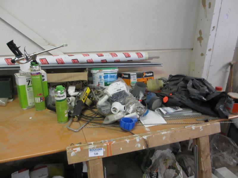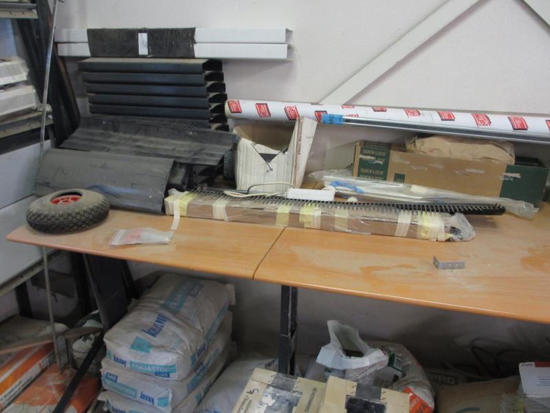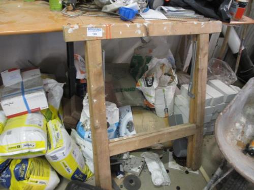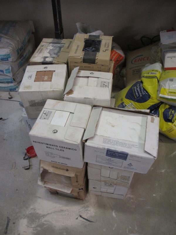 1 grote partij divers w.o. 1 kruiwagen, tegels, mortel, stuc etc.
