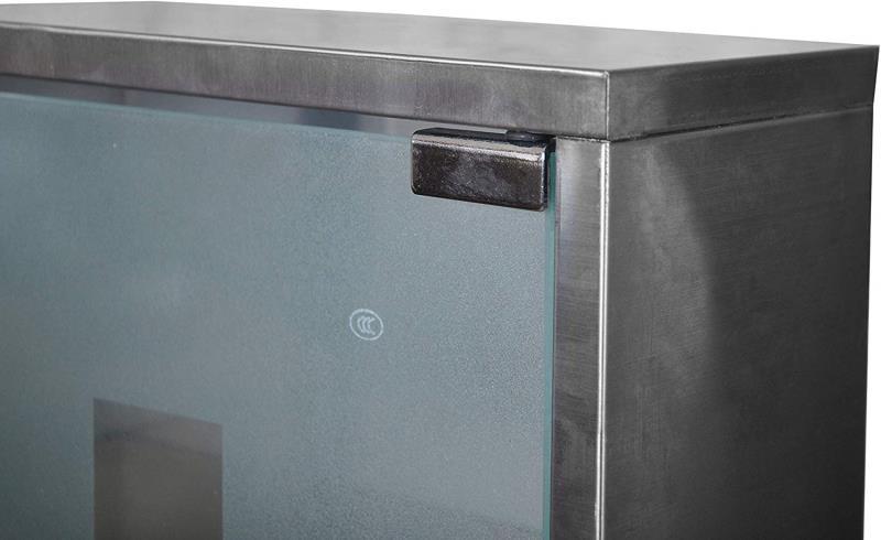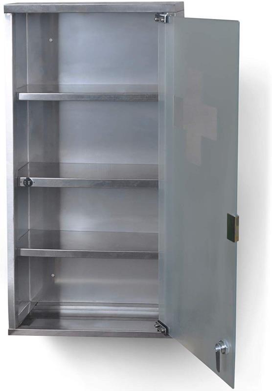 5 compartimenten, met matglazen deur; Magnetisch systeem voor het sluiten van deuren; Inclusief 2 sleutels; Eenvoudige wandmontage. Technische informatie: Afmetingen: Structuur (lengte x hoogte x breedte): 60 x 30 x 12 cm Deur (lengte x hoogte): 26,5 x 56,2 cm Hoogte compartimenten: Top: 15,4 cm Bodem: 13 cm Materialen: Structuur: roestvrij staal Deur: matglas (5 mm dik) Details: Eerste hulpsymbool op de deur gestempeld Kleur: zilver
