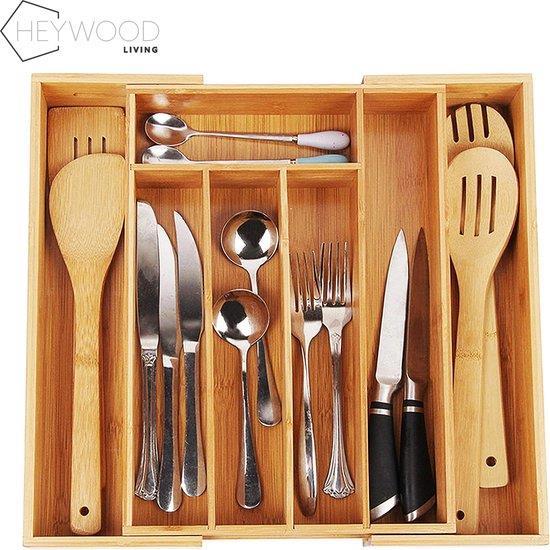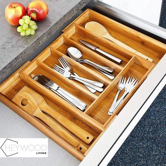 De Heywood Living bamboe bestekbak is ruim genoeg voor al je bestek of andere keukengerei. De verschillende vakken zorgen voor orde in de besteklade. De vakken zijn uit te breiden van zes naar zeven of acht vakken door deze aan de linker- of rechterzijde uit te schuiven. Dit maakt de bestekbak geschikt voor vrijwel iedere keukenlade.