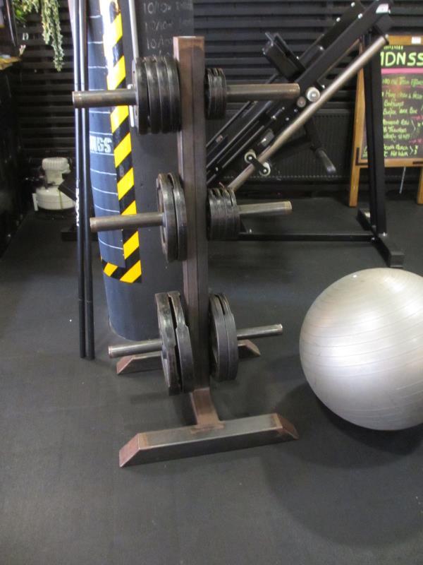1 schijvenstandaard met Barbarian Barbell schijven, 3 x 1,25 kg., 4 x 2,5 kg., 2 x 10 kg., 2 x 15 kg., 2 x 25 kg. en 4 x 5 kg.