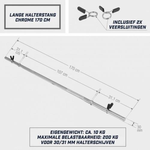 • Bij de levering inbegrepen: Halterstang 170cm incl. 2 veersluitingen voor het vastzetten van de gewichten inbegrepen