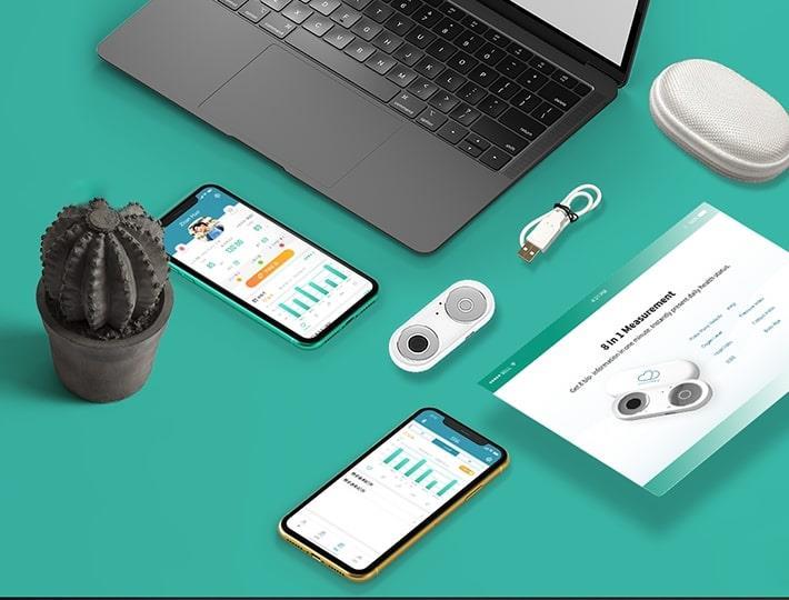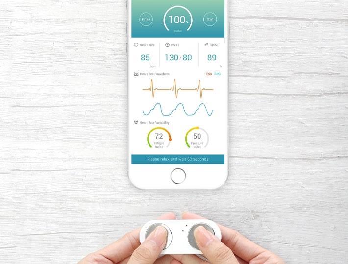Detecteer 8 verschillende statistieken over uw fysieke conditie op elk moment (Lichaamsleeftijd, Hartslag, Pulse Wave Transit Time, Diastolische en systolische bloeddruk, SpO2, Vermoeidheidsindex en Stressindex door photoplethysmography (PPG) en Electroskingraphy (ESG)), overal in slechts 60 seconden