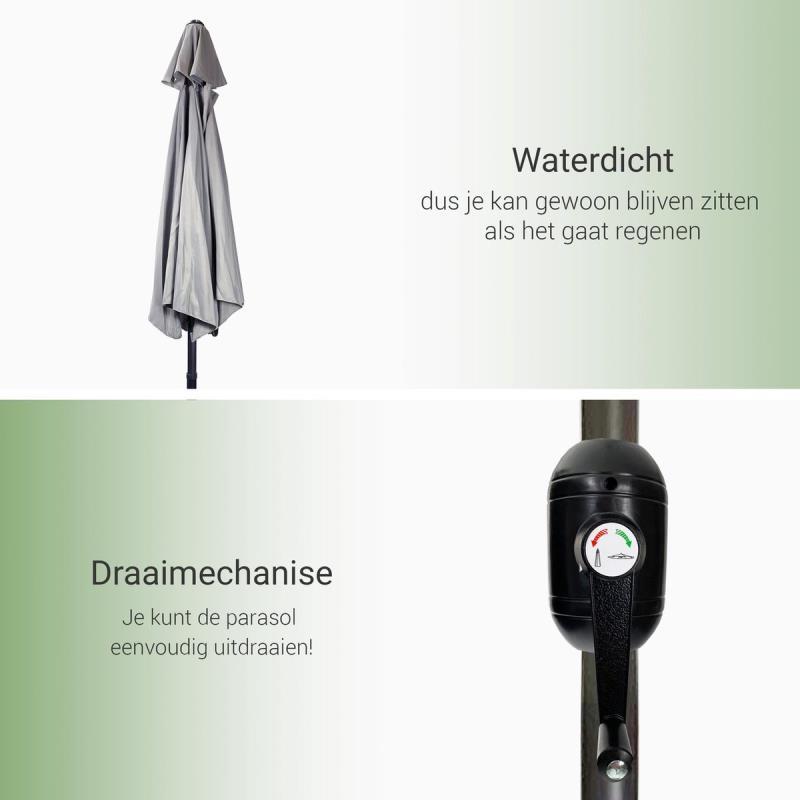 Het doek en frame zijn gemaakt weerbestendige, waterafstotende materialen en dus blijven deze lang mooi. Zelfs tijdens een zomerse regenbui zit je er nog prima bij. Als de zon weg is klap je de parasol met een paar klikken op. Ideaal!