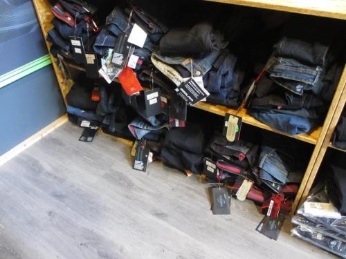 de inhoud van de kast w.o.motorjeans in diverse maten, diverse kleuren en diverse merken w.o. Richa, Esquad etc.