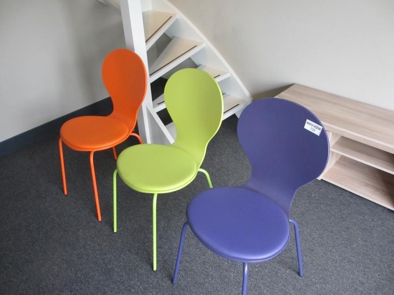 3 eetkamerstoelen, oranje, groen paars