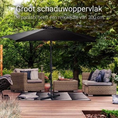 Met deze parasol kun jij een heerlijk schaduwplekje in de tuin creëren. Deze zwarte parasol geeft jouw tuin niet alleen een luxe uitstraling, maar beschermt je ook tegen de felle zonnestralen. Dit exemplaar heeft een 160 grams polyester doek en een sterk aluminium frame met een dikte van 38 millimeter. De stok heeft een poedercoating en is voorzien van een handige draaihendel, waardoor je de parasol eenvoudig op de juiste hoogte kunt instellen. Bovendien heeft deze parasol een diameter van 270 centimeter en een maximale hoogte van wel 245 centimeter.