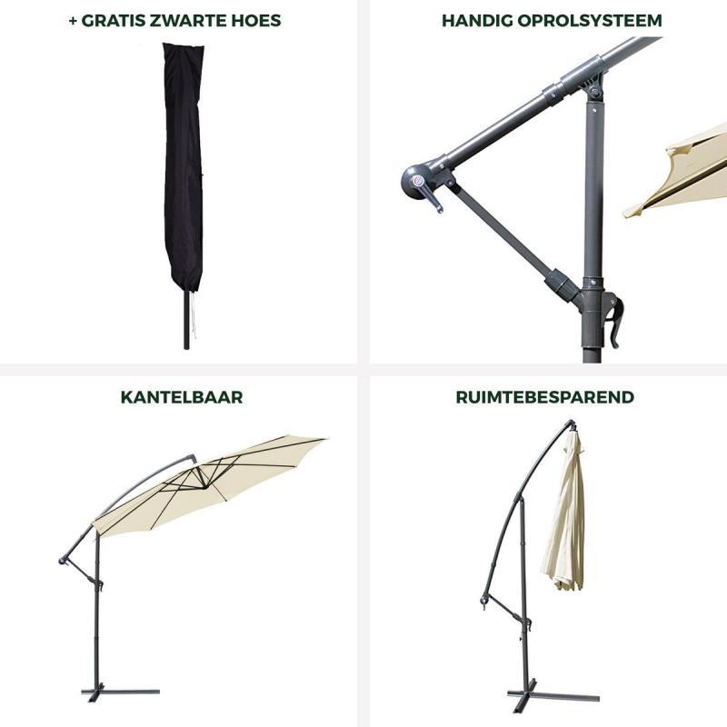 Het handige van deze zweefparasol is dat hij 180 graden te draaien en 60 graden te kantelen is. Hierdoor kan je op elk moment van de dag de perfecte hoek creëren tegen de zon!