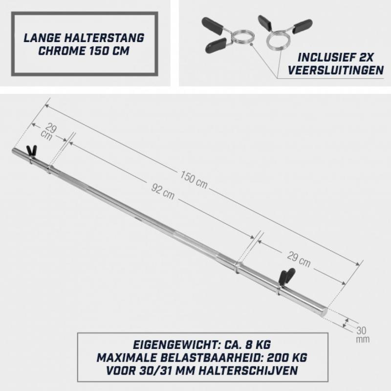 Met de lange halterstang chroom 150 cm train je comfortabel overal waar een stang met de gebruikelijke lengte van 150 cm handelbaar is. Gebruik de halterstang bij een halterbank met een smalle zitting of voor fitness oefeningen zonder bank. Gebruik het om de spieren van de schouders, armen en rug te versterken. De halterstang chroom 150 cm is voorzien van praktische veersluitingen voor het vastzetten van de halterschijven. Met dit onderdeel kun je de halterschijven bijzonder snel wisselen zonder lange schroeven. De halterstang is gegroefd in het greep gebied om een goede grip te garanderen. De diameter van de stang is 30 millimeter. Dit betekent dat deze halterstang past op alle gewichten met een diameter van 31 millimeter. De halterstang is ook ideaal voor squats.