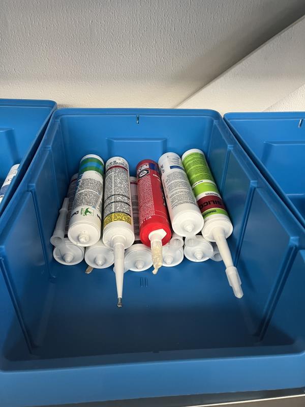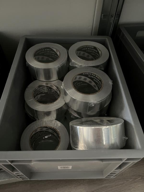 9 delen metalen stelling met inhoud w.o. montagemateriaal, kitten, isolatietape, aansluitkabels, pvc buizen en bochten etc.