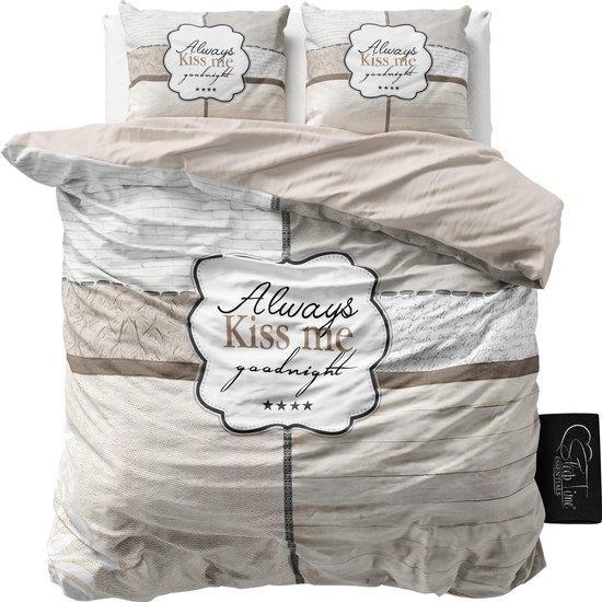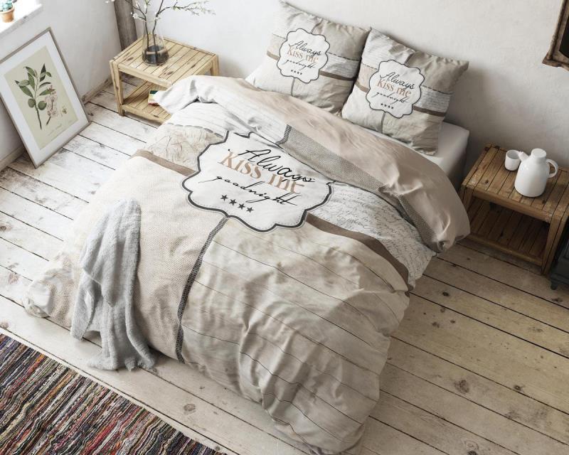 Het Sleeptime Kiss Me-dekbedovertrek is ideaal voor koppels. Het overtrek geeft met de tekst “Always Kiss Me Goodnight” een duidelijke boodschap aan beide partners. Dit zorgt natuurlijk voor een romantische en aangename sfeer in je slaapkamer. Met dit prachtige dekbedovertrek is je bed het stralende middelpunt van je slaapkamer. Vanwege zijn neutrale grijs-bruine kleur kun je het overtrek makkelijk combineren en staat het leuk in haast elke interieurstijl. Het dekbedovertrek wordt geleverd met bijpassende kussenslopen die het geheel compleet maken.