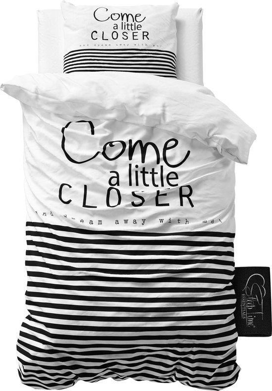 Onder dit moderne en stijlvolle Sleeptime Little Closer-dekbedovertrek geniet je elke nacht opnieuw van een goede nachtrust. Het overtrek heeft een gestreepte print en is voorzien van de leuke tekst ''Come a little closer''. Je kunt dit Sleeptime Little Closer-dekbedovertrek makkelijk met andere kleuren en slaapkameraccessoires combineren. Voor een harmonieus geheel kun je een leuke sprei of sierkussens op je bed leggen. Uiteraard wordt dit Sleeptime Little Closer-dekbedovertrek geleverd met 2 bijpassende kussenslopen die dezelfde gestreepte print en tekst hebben.