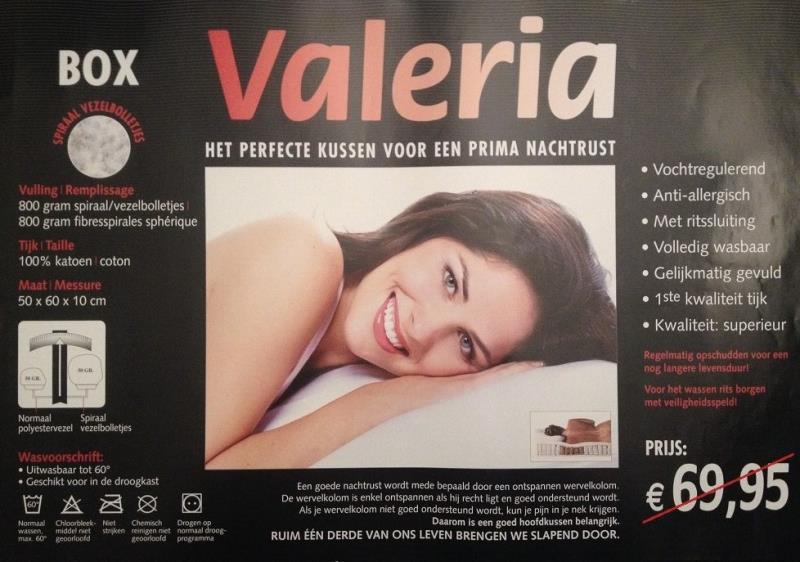 De box hoofdkussens van Valeria zijn katoenen boxkussens gevuld met duizenden luxe veerkrachtige en duurzame synthetische holle vezels. De vulling kan worden bijgestuurd met behulp van een rits en daarmee de hoogte en dikte zelf bepalen. Het kussen is anti-allergisch en uitwasbaar tot 60 graden. De tijk is van 100% katoen.
