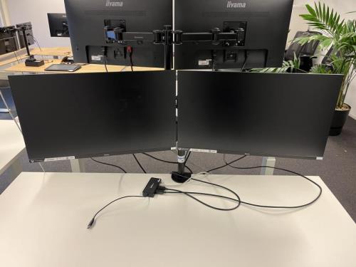 2 x Ilyama Blackhawk G Master monitor, model PL2740QS met Newstar Flatscreen Dual Desk Mount