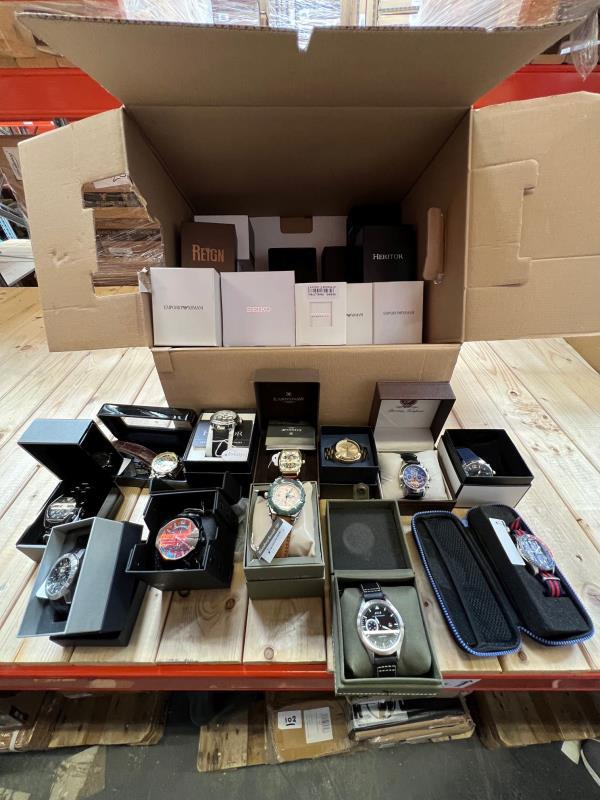 1 doos met ca. 34 stuks horloges en horlogebanden van diverse kleuren, materialen en merken w.o. Timberland, Deep Blue, Seiko, Armani, Earnshaw. etc Dit betreft een partij horloges die deels retourgoederen zijn en deels ter reparatie aangeboden zijn. Werking onbekend.