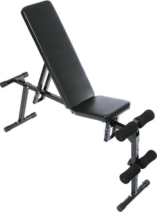 Compacte halterbank voor veelzijdig spiertrainingenGeschikt voor beginners en gevorderdenPraktische beinstütze9 standen verstelbare rugleuning3 standen instelbare zitkussenStabiele staalbuisconstructieComfortabel rugkussenEenvoudige montage en bedieningGemakkelijk opvouwbaarSterk gecomprimeerd polsterrollenVeelzijdige trainingmöglichkeiten:Military Press (schouder training met verticale leuning)Schuin en flachbankdrückenwegdrijven negatieve bankdrukken (met abgesenkter leuning)negatieve sit-ups (bauchmuskeltrainingwordt gebruikt in combinatie met andere fitness-apparatuur voor universeel fitnessapparaat met het vrijwel allemuskelgrupppen traint kunnen worden.Technische gegevensAfmetingen (l/B/H): ca. 133/33/48 – 120 cmAfmetingen zetel (H): ca. 48 cmleuning (H): ca. 71 cmGewicht: ca. 11 kgMax. belasting: 240 kg (incl. gewichten en lichaamsgewicht)Max. lichaamsgewicht 100 kgMax. belasting beinübungen: 60 kgMateriaal: staal kunstleer kunststofKleur: zwart