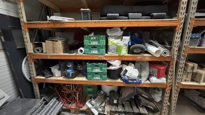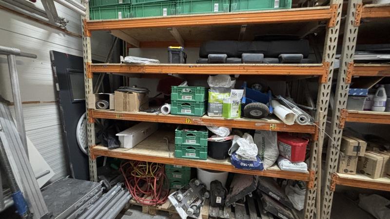 2 delen palletstelling met inhoud w.o. tegels, lijmen, isolatiemateriaal, zink, bevestigingsmaterialen etc. (m.u.v. genummerde kavels, autobank en eetkamerstoelen)