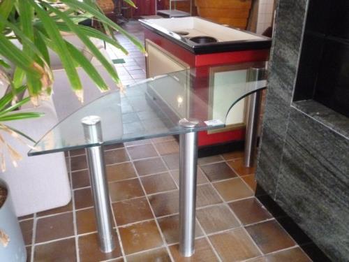 85 - 109 : 1 kwart ronde tafel met rvs poten en glazen blad