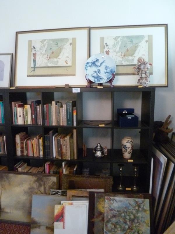 1 boekenkast met inhoud w.o. boeken, kandelaars, schilderijen etc. etc.
