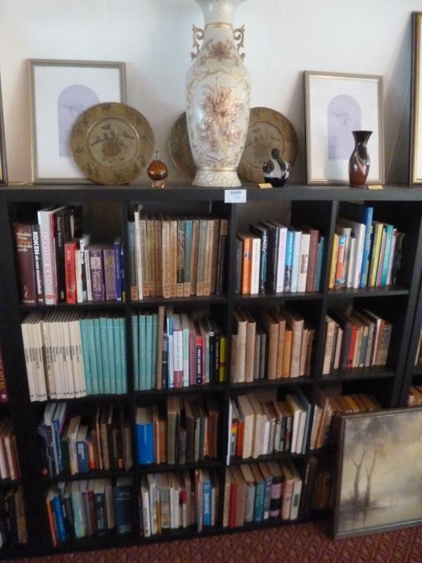 1 boekenkast met inhoud w.o. vazen, borden, boeken, schilderijen etc. etc.