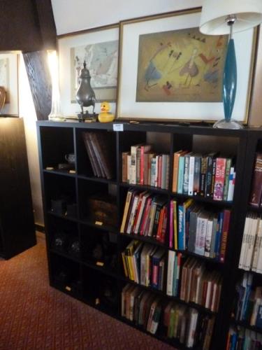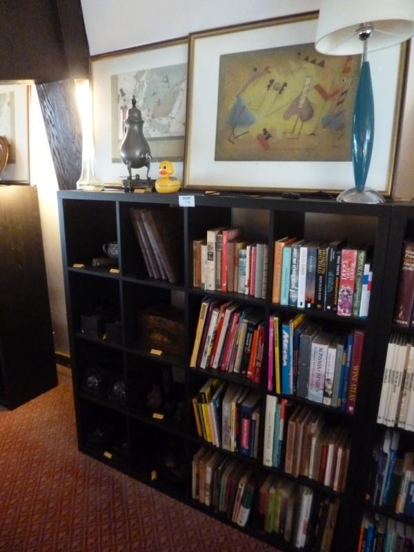 1 boekenekast met inhoud w.o. boeken, schilderijen, lamp, glazen bol etc. etc.