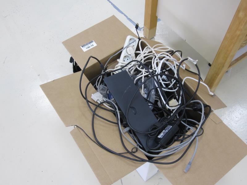 140 - 19 : 1 doos met inhoud w.o. kabels, toetsenborden, muizen etc