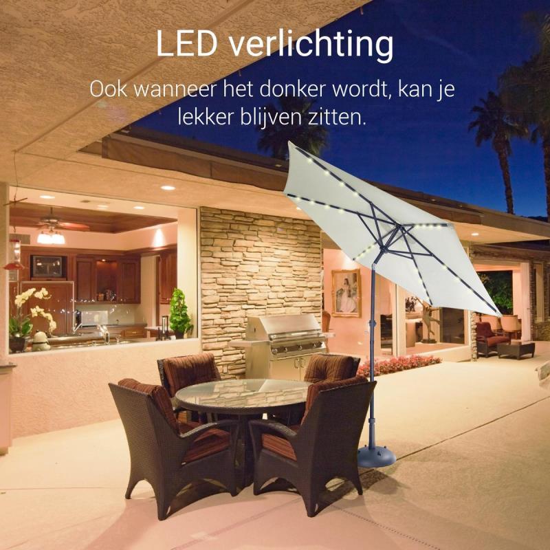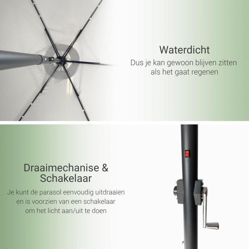 Het stabiele, metalen frame zorgt ervoor dat de parasol stevig staat. Het doek en frame zijn gemaakt weerbestendige, waterafstotende materialen en dus blijven deze lang mooi. Zelfs tijdens een zomerse regenbui zit je er nog prima bij. Als de zon weg is klap je de parasol met een paar klikken op óf zet je de verlichting aan! Ideaal!