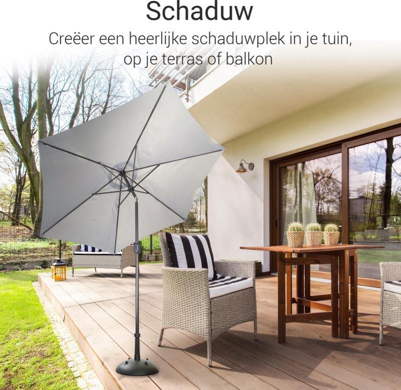 Het doek en frame zijn gemaakt weerbestendige, waterafstotende materialen en dus blijven deze lang mooi. Zelfs tijdens een zomerse regenbui zit je er nog prima bij. Als de zon weg is klap je de parasol met een paar klikken op. Ideaal!