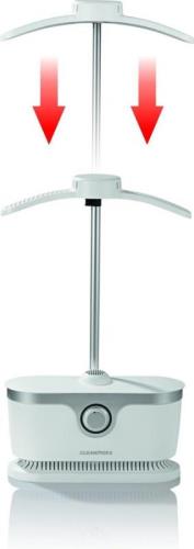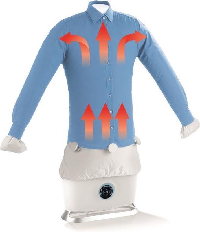 Plaats het gecentrifugeerde overhemd, blouse, T-shirt of trui over de opblaasvorm van de Cleanmaxx en met de bijgevoegde klemmen bevestigen. De timer op de gewenste duur zetten en de opblaasvorm blaast zich op en geeft tegelijkertijd warmte af aan het kledingstuk. Volledig automatisch!