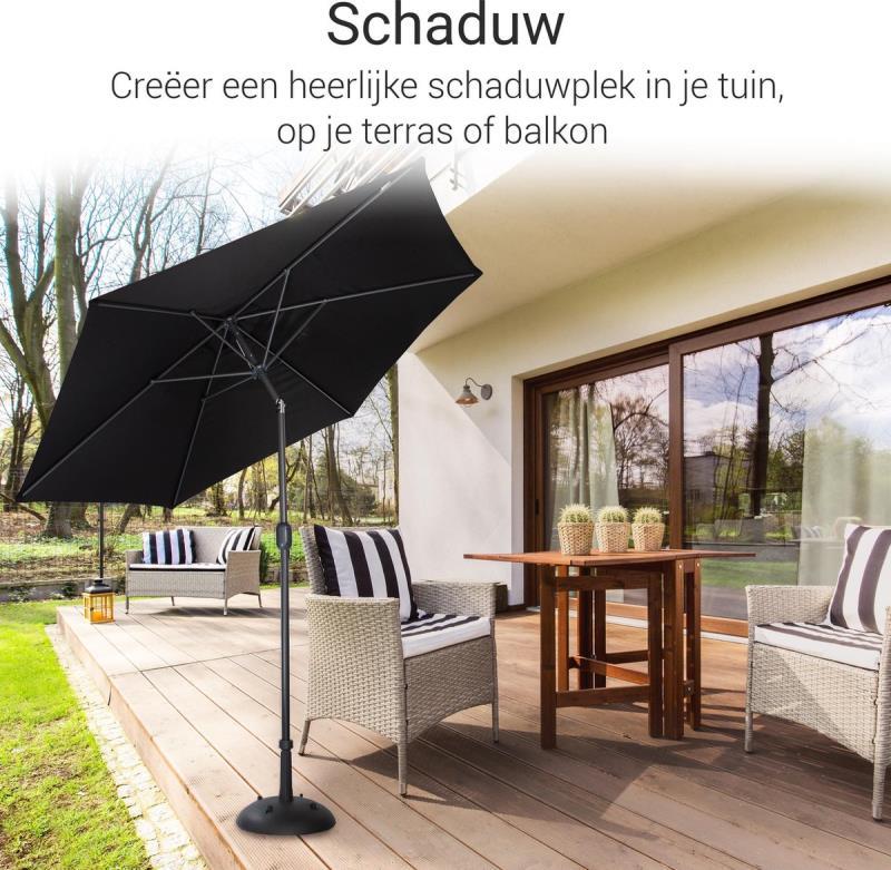 Luxe stokparasol, zwart - Deze parasol beschermt jou tegen de zon en geeft jouw tuin een luxe uitstraling. Dit exemplaar heeft een zwart doek en een donker grijs frame. De parasol heeft een diameter van 270 centimeter en kan door middel van de draaihendel eenvoudig op de juiste hoogte ingesteld worden. Bovendien is het aluminium frame voorzien van een poedercoating voor een luxe uitstraling. Zwarte terras parasol voor een luxe uitstraling Met deze parasol kun jij een heerlijk schaduwplekje in de tuin creëren. Deze zwarte parasol geeft jouw tuin niet alleen een luxe uitstraling, maar beschermt je ook tegen de felle zonnestralen. Dit exemplaar heeft een 160 grams polyester doek en een sterk aluminium frame met een dikte van 38 millimeter. De stok heeft een poedercoating en is voorzien van een handige draaihendel, waardoor je de parasol eenvoudig op de juiste hoogte kunt instellen. Bovendien heeft deze parasol een diameter van 270 centimeter en een maximale hoogte van wel 245 centimeter. Eigenschappen: Zwarte parasol Voorzien van draaihendel In hoogte verstelbaar Diameter: 270 centimeter Materiaal doek: polyester (160 gr/ m²) Materiaal frame: aluminium Kleur frame: donker grijs Diameter stok: 38 millimeter Maximale hoogte: 245 centimeter Let op: wordt geleverd zonder parasolvoet