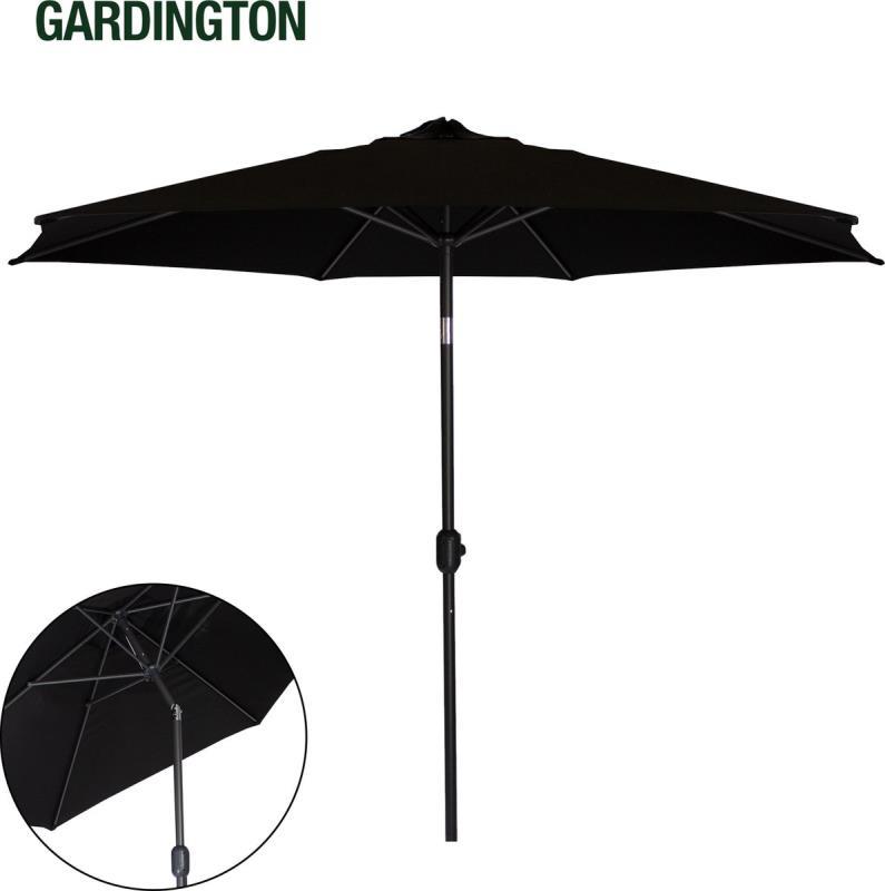 Luxe stokparasol, zwart - Deze parasol beschermt jou tegen de zon en geeft jouw tuin een luxe uitstraling. Dit exemplaar heeft een zwart doek en een donker grijs frame. De parasol heeft een diameter van 270 centimeter en kan door middel van de draaihendel eenvoudig op de juiste hoogte ingesteld worden. Bovendien is het aluminium frame voorzien van een poedercoating voor een luxe uitstraling. Zwarte terras parasol voor een luxe uitstraling Met deze parasol kun jij een heerlijk schaduwplekje in de tuin creëren. Deze zwarte parasol geeft jouw tuin niet alleen een luxe uitstraling, maar beschermt je ook tegen de felle zonnestralen. Dit exemplaar heeft een 160 grams polyester doek en een sterk aluminium frame met een dikte van 38 millimeter. De stok heeft een poedercoating en is voorzien van een handige draaihendel, waardoor je de parasol eenvoudig op de juiste hoogte kunt instellen. Bovendien heeft deze parasol een diameter van 270 centimeter en een maximale hoogte van wel 245 centimeter. Eigenschappen: Zwarte parasol Voorzien van draaihendel In hoogte verstelbaar Diameter: 270 centimeter Materiaal doek: polyester (160 gr/ m²) Materiaal frame: aluminium Kleur frame: donker grijs Diameter stok: 38 millimeter Maximale hoogte: 245 centimeter Let op: wordt geleverd zonder parasolvoet
