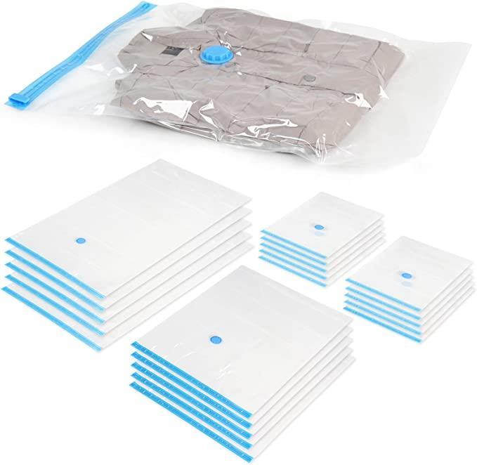 20 vacuüm opberghoezen, 3 verschillende maten 5 x ca. 70/120 cm, 5 x ca. 60/80 cm, 10 x ca. 40/60 cm Eenvoudige luchtafzuiging met een standaard stofzuiger Hermetisch gesloten dankzij de rits, herbruikbaar naar believen Tot 75% ruimtebesparing voor uw textiel