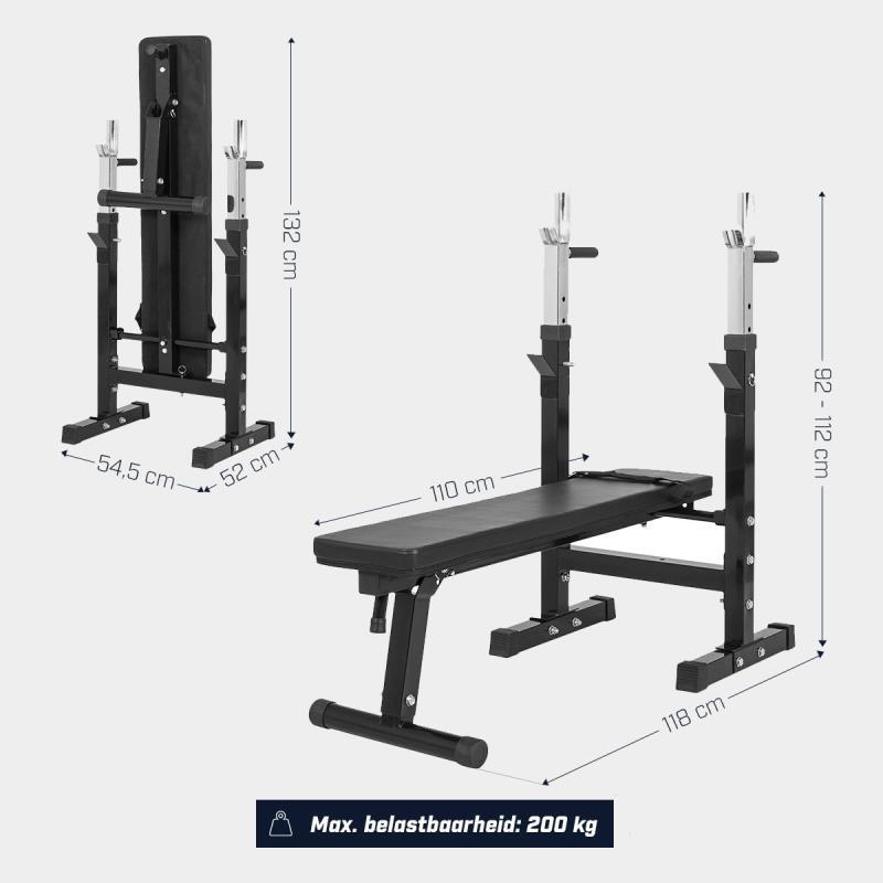 De ideale halterbank om thuis de borst, triceps en buikspieren te trainen. De verstelbare haltersteunen zijn te belasten tot 200 kg. Deze bank is voorzien van dipsteunen en ook te gebruiken voor incline benchpress. De bench is eenvoudig opklapbaar. Bankdrukken is dé manier om spiermassa te kweken. Helaas weten de meeste bezoekers van de sportschool dit, hierdoor moet je vaak lang wachten voordat er een halterbank vrij is. De oplossing: je haalt gewoon je eigen halterbank in huis. Dit apparaat is zwaar te belasten, uitgerust met verstelbare haltersteunen, ook te gebruiken als buikspierbank, en bovendien geschikt om dips op uit te voeren! De verstelbare halterbank in detail: Afmeting (LxBxH): 120 x 54,5 x 112 cm Afmeting ingeklapt (DxBxH) : 52 x 54,5 x 132 cm Afmeting kussen: 110 x 25 x 5 cm Afstand liggedeelte tot vloer: 40 cm Afstand tussen de haltersteunen: 54,5 cm Maximale belastbaarheid Bank: 200 kg Maximale belastbaarheid Haltersteunen: 200 kg Maximale belastbaarheid Dipsteunen: Totaal 120 kg Product gewicht: 20 kg Verstelbare hellingshoek (15°) Haltersteunen verstelbaar in 5 postities Geïntegreerde dip-bars De band wordt gebruikt als steun voor Decline Sit Ups Dit Old School model halterbank is een luxe uitvoering: stevig gebouwd en daardoor geschikt voor het zware werk. De haltersteunen kunnen belast worden tot maar liefst 200 kg, je kunt dus helemaal los gaan. Nodig thuis je fitnessmaatje uit om samen ouderwets te banken en creëer zo een solide partij borstspieren, triceps en schouders. De halterbank is uiteraard ook geschikt voor dames of mannen die trainen met lichtere gewichten. Met bankdrukken train je in de eerste plaats je borstspieren. Maar ook je triceps komen aan bod. De beste manier om op je triceps te focussen is door 'smal' te bankdrukken. Dit is voor de dames de oplossing tegen zwabberige armen, en voor mannen de manier om de bovenarmen aan te pakken en zodoende flink wat spiermassa in de mouwen te krijgen! De halterbank is uitgerust met in hoogte verstelbare haltersteunen, waardoor je de halter op de voor jou ideale hoogte kunt laten rusten. De bank biedt de mogelijkheid om versteld te worden tot buikspierbank, waardoor je je training afrondt met de nodige aandacht voor je abs. Maar er is meer: aan de achterzijde van de haltersteunen bevinden zich twee dipsteunen, waardoor je je borst en triceps dus gevariëerd kunt aanpakken. Een oude fitness wijsheid zegt "variation is key", en dat hebben de makers van deze halterbank zich ter harte genomen. De bank is het perfecte exemplaar voor thuis fitness en eenvoudig inklapbaar.
