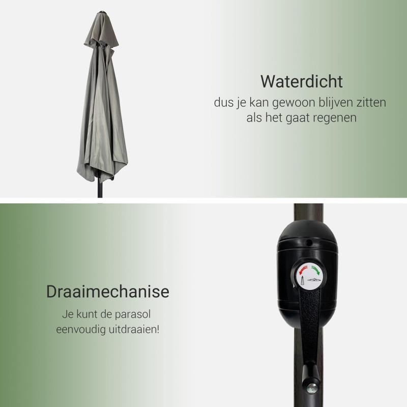 Het doek en frame zijn gemaakt weerbestendige, waterafstotende materialen en dus blijven deze lang mooi. Zelfs tijdens een zomerse regenbui zit je er nog prima bij. Als de zon weg is klap je de parasol met een paar klikken op. Ideaal!