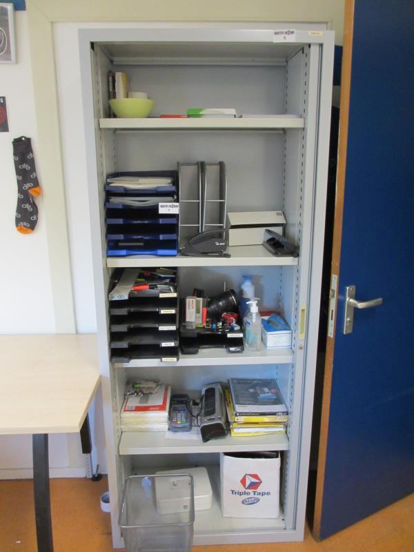 de inhoud van de hoge jaloeziedeurkast w.o. divers kantoorgerief