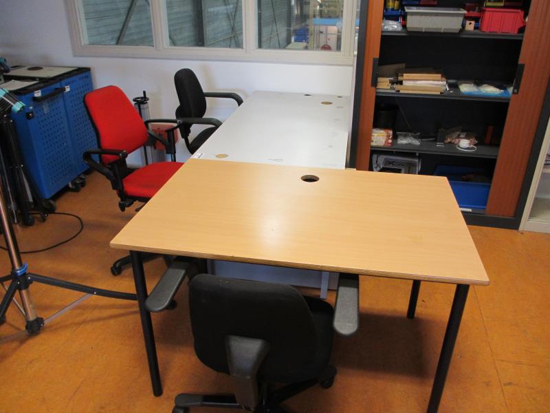 1 bureautafel met ladeblok, 1 bureautafel, 3 bureaustoelen en 1 whitebord