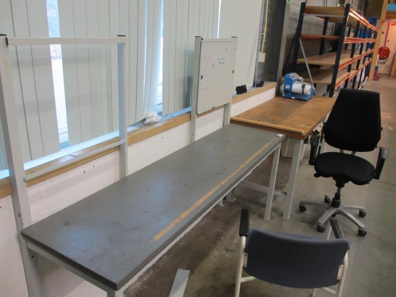 1 montagetafel met werkbank, ladeblok, bureaustoel en 1 stoel