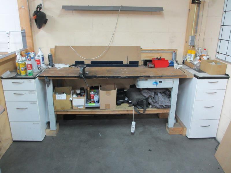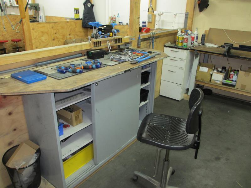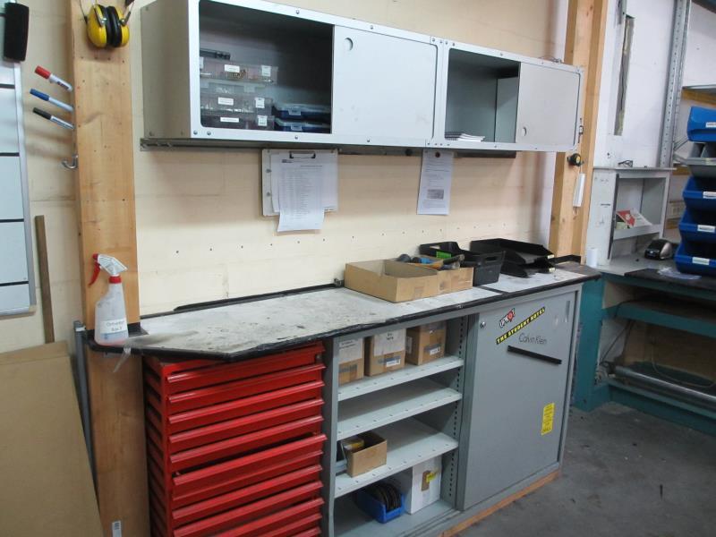 1 montagehoek met 1 werkbank met bankschroef, 2 4-ladenkasten, 2 schuifdeurkasten, 1 doe meer stoel, 1 hoge werktafel, 1 Dymo labelprinter, model 450