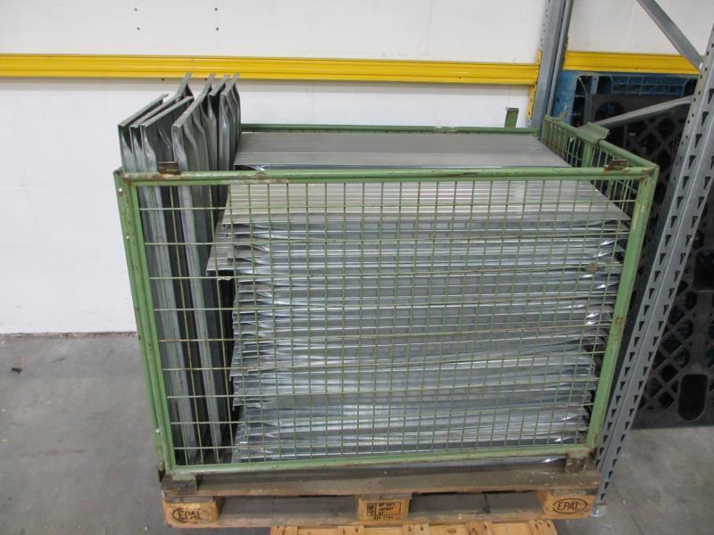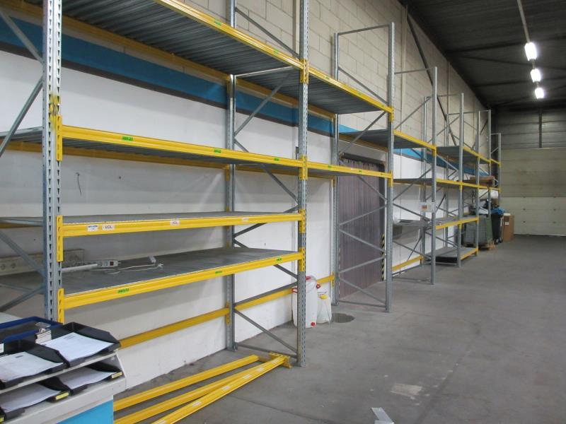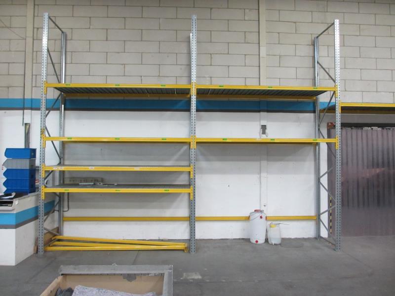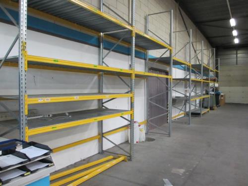 1 7-delige legbordstelling, ca. 20 mtr. met 8 jukken ca. 400 cm., 19 paar ligger 275 cm., 16 legborden en 1 pallet leggborden