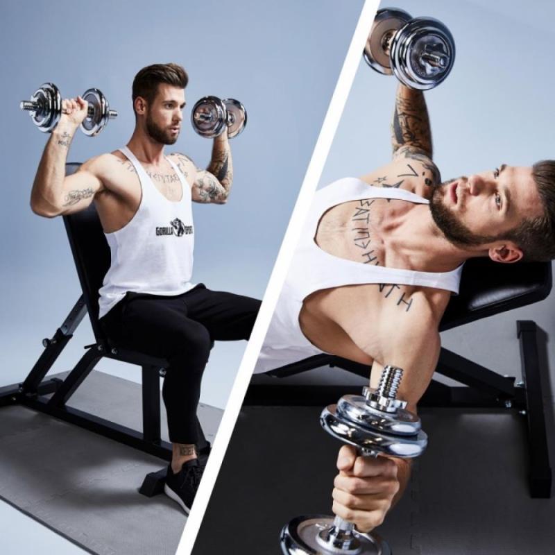 Deze multifunctionele fitnessbank is voor professioneel gebruik. De bank is zeer stabiel en geschikt voor dumbell presses, military presses, flyes en bankdrukken (schouders, borst, biceps, triceps). Deze bench is verstelbaar in zes posities en maximaal belastbaar tot 200 kg. Heb je halters, dan heb je natuurlijk ook een bank nodig! Daarom bieden we een oerdegelijke, multifunctionele fitnessbank aan, waarmee je perfect thuis kunt trainen. Deze bank is zeer stabiel en multifunctioneel, of je nou je borstspieren (schuin of vlak), je schouders of je biceps wilt trainen, het kan allemaal! Deze multifunctionele fitnessbank is van de hoogste kwaliteit en zeer stabiel. De bank is verstelbaar in maar liefst zes verschillende posities waardoor je de mogelijkheid hebt om zeer gevariëerd te trainen. En dat komt goed uit, want variatie is één van de voorwaarden om effectief te trainen. De multifunctionele fitnessbank zwart in detail: Leuning verstelbaar in 7 standen (90 graden) Zitting verstelbaar in 4 standen Max. Belastbaarheid van de rugleuning: 200 kg Max. Belastbaarheid zitkussen: 200 kg Afmeting (L x B x H): 119 x 56 x 48 - 117 cm Afmeting rugleuning (L x B x H): 72 x 25 x 4,5 cm Afmeting zitkussen (L x B x H): 35 x 25 x 4,5 cm Gewicht: 19 kg Schouders trainen Als je de rugleuning van de bank rechtop zet, kun je op de multifunctionele bank perfect shoulder presses uitvoeren, één van de meest effectieve manieren om de schouders te trainen. Ook lateral side raises kun je zittend uitvoeren op de bank. Het voordeel van het zittend trainen van de schouders ten opzichte van het staand uitvoeren van de oefening is de stabiliteit die de bank biedt. Als je je schouders zwaar wilt trainen en dit staande doet, liggen onderrugblessures op de loer. Het trainen van de schouderspieren is een dankbare en voor veel mensen snelle methode om 'breed' te worden. De spiergroepen in de schouders bevatten namelijk relatief weinig vet ten opzichte van andere spiergroepen in het lichaam, waardoor vorderingen zeer snel zichtbaar zijn. De borst aanpakken Naast bankdrukken (met de lange halter) is dumbell pressing één van de meest populaire manieren om de borstspieren te trainen. Op de multi bench kun je zowel schuin drukken - om meer de bovenste delen van de borst aan te pakken - als vlak. Uiteraard kun je ook andere effectieve dumbell of kettlebell oefeningen voor de borst uitvoeren op de multi bench (denk hierbij aan flyes of arm-pullovers). Doordat de bank oerdegelijk en zeer solide gebouwd is, kun je echt zwaar gaan. Met behulp van haltersteunen is de bank ook prima geschikt om te bankdrukken. Triceps en biceps Met behulp van een triceps bomber, een EZ curl stang of een gewone halterstang (close grip presses), kun je op de multi bench perfect je triceps trainen, de grootste spiergroep in de bovenarmen. Maar ook de biceps kun je met behulp van de bench goed isoleren, door middel van concentration curls (zittend uitgevoerd, of staande, gebruikmakend van de schuine leuning).