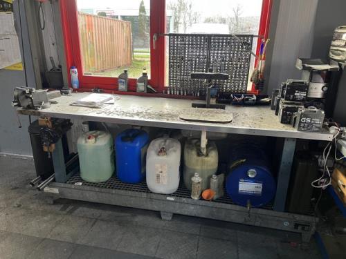1 werkbank met bankschroef en lekbak, ca 3 mtr