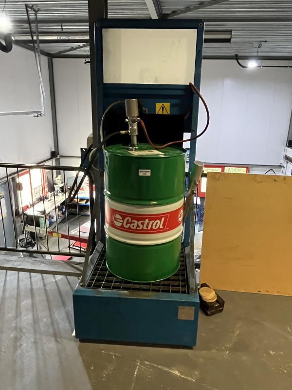 221 - 120 : de olie-instalatie met lekbak, olievat, oliepomp, leidingwerk, haspel en vulpistool