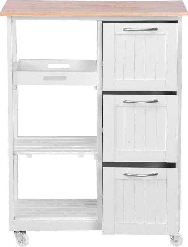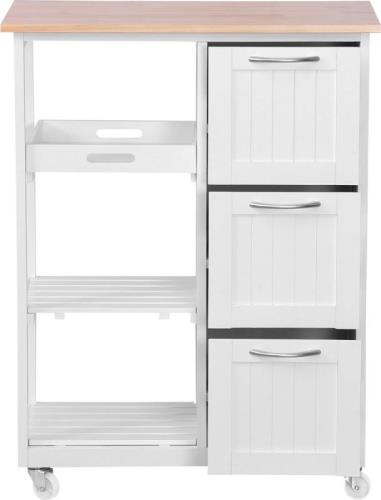 Keuken trolley op wieltjes - 3 lades en 3 plankjes - Wit Altijd al een keukentrolley in de keuken willen hebben? Dan hebben wij nu een superleuke aanbieding voor jou! De keukentrolley is gemaakt van hoogwaardig materiaal en handig in gebruik. Door zijn compacte formaat en moderne uitstraling past hij in iedere keuken. Door de zwenkwielen is deze trolley praktisch in gebruik. Zet hem op een vaste plek in de keuken of rol hem door jouw appartement of woonkamer. De trolley is onder andere geschikt om jouw (kook)boeken of keukenaccessoires goed te organiseren en bij de hand te hebben. Gebruik de trolley in de keuken of zomers bij het bbq’en. Uiteraard dient hij ’s avonds wel weer binnen te worden gezet. Deze keukentrolley beschikt over diverse planken en lades en heeft hierdoor een ruime opslagcapaciteit. * Keuken trolley op wieltjes, 3 lades en 3 plankjes, in wit, country house stijl. * Een van de niveaus dient ook als een verwijderbare serveer tray. * Afmetingen: 67 x 37 x