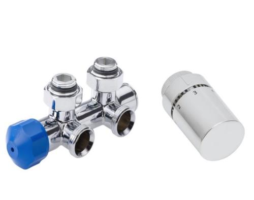 Bestaande uit armatuur en thermostaatkop, verchroomt, ventiel voorinstelbaar, thermostaatkop begrensbaar, aan weerszijde te monteren (wisselen aanvoer/retour), geïntegreerde retouraansluiting