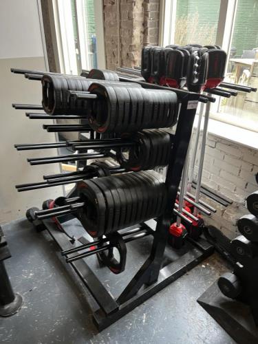 1 rek met 10 halterstangen en 53 diverse halterschijven