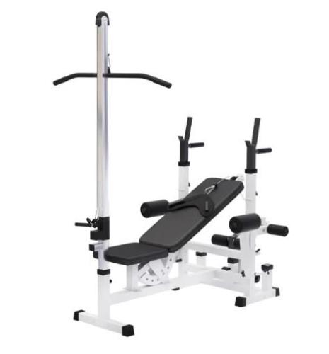 Deze multifunctionele halterbank is voorzien van een curlrack, lat pulley, dipsteunen en kabels, daardoor kun je je borstspieren, schouders, biceps, triceps, rug -en buikspieren trainen. De bank, rugleuning en curlrack zijn verstelbaar. De haltersteunen zijn belastbaar tot 180 kg en de bank tot 280. Let op: product demonteren op locatie niet mogelijk.