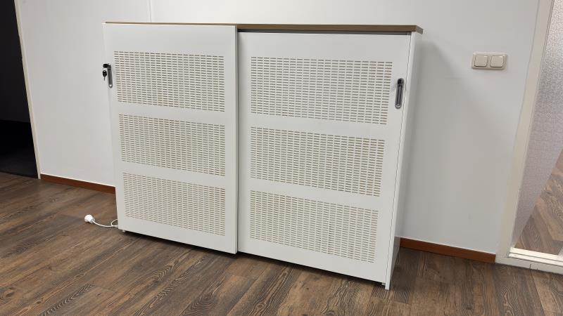 1 halfhoge schuifdeurkast, afm. ca. 160 x 120 cm. met inhoud
